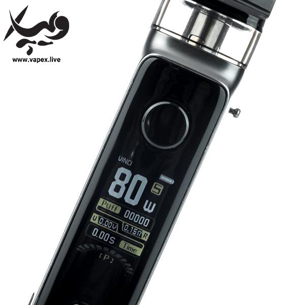 این نسخه از Vinci X ، دارای رابط کاربری بی نظیری است. اگر به پنل جلوی دستگاه نگاه کنید ، صفحه نمایش ۱.۰۸ اینچ رنگی این دستگاه را مشاهده می کنید که با منوی آسان و طراحی خاص ، فرآیند تنظیمات آن را آسان می سازد. کمی پایین تر از این صفحه نمایش ، دو دکمه ی مثبت و منفی برای تنظیم دستگاه قرار گرفته اند. به کمک این دو دکمه ، شما می توانید دستگاهتان را بین ۵ تا ۸۰ وات بسته به کویل و نوع مصرف ، تنظیم کنید. به طور کلی ، این دستگاه هم برای مصرف سالت نیکوتین و هم مصرف جویس معمولی بهینه سازی شده است. در پایین دستگاه نیز ، شما به یک درب کوچک برای نصب یک باتری تکی ۱۸۶۵۰ دسترسی خواهید داشت.