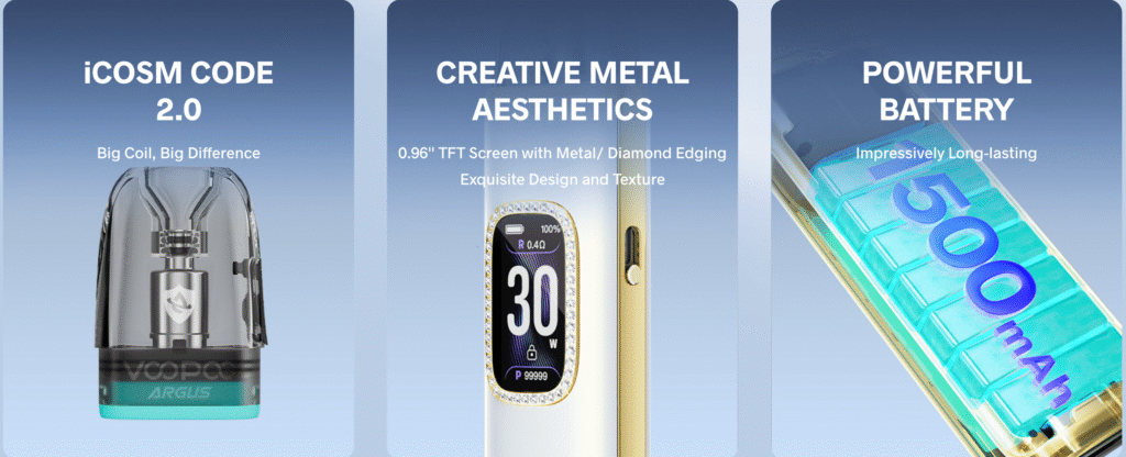 پاد آرگاس جی ۳ ووپو با بهره‌گیری از فناوری iCOSM CODE 2.0، طعم ای‌جویس را با دقت بالا و بدون افت کیفیت منتقل می‌کند. کویل‌های سری ARGUS با ساختار مش، عملکرد یکنواختی در تولید بخار و حفظ طعم دارند و برای مصرف با سالت نیکوتین یا ای‌جویس‌های معمولی بسیار مناسب هستند.