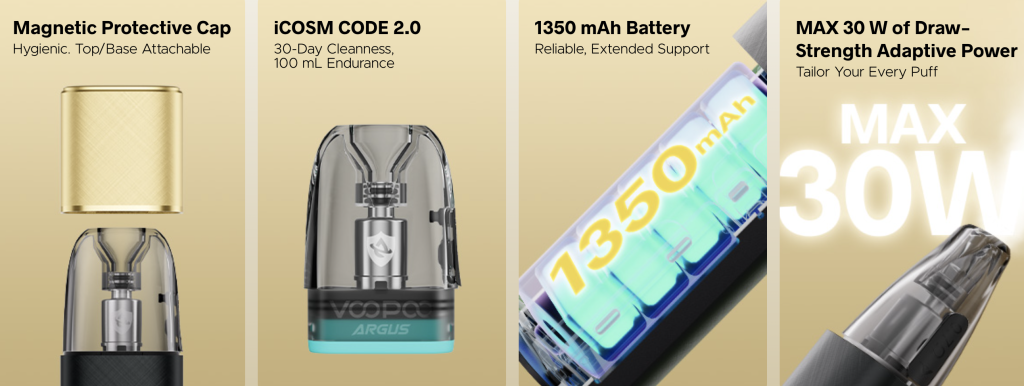 پاد ووپو آرگاس کلیک از کارتریج نسل جدید V2 استفاده میکند که بر پایه فناوری iCOSM CODE 2.0 ساخته شده است.